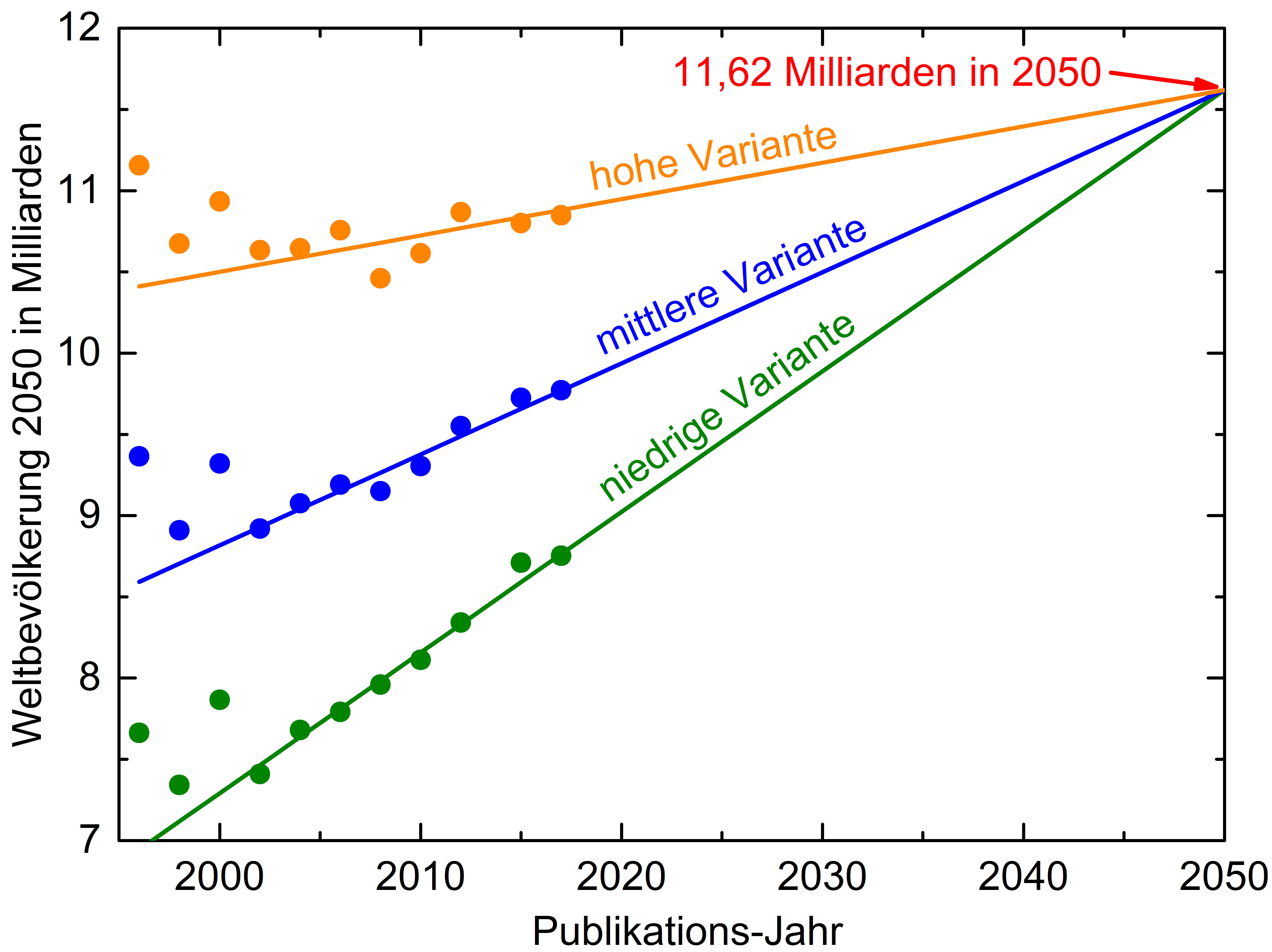 Den Trend in Abbildung 2 kann man nun durch Geraden annähern, die die Daten seit 2002 beschreiben. Die Geraden für die drei Varianten müssen sich in 2050 treffen, weil in diesem Publikationsjahr die Zahl der Menschen ja eigentlich nur noch nachgezählt werden muss, was zu einer eindeutigen Zahl führt. Praktisch wird es auch in 2050 zwar nur eine Abschätzung geben, die Unsicherheit wird aber so klein sein, dass dies hier durch einen einzigen Wert angenähert werden kann. Die Steigungen der Geraden und der Schnittpunkt in 2050 wurden numerisch an die Daten angepasst. Es ergibt sich für 2050 ein Wert von 11,62 Milliarden Menschen. Dieser Wert ist auch in Abbildung 1 mit eingetragen. Es wird deutlich, dass diese Auswertung sogar deutlich über der hohen Variante liegt. Damit ist die hohe Variante mindestens so wahrscheinlich wie die üblicherweise verwendete mittlere Variante.