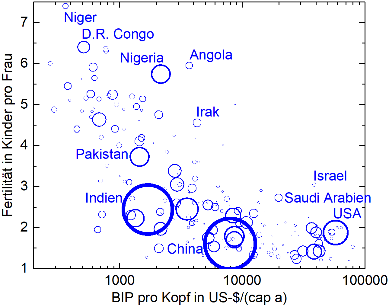 Die Grafik zeigt, dass die Fertilität in vielen Ländern noch sehr viel höher als dieser nachhaltige Wert ist. Darunter sind auch Länder wie Nigeria, die selbst bereits eine recht große Einwohnerzahl aufweisen, was durch die Größe der Kreise charakterisiert ist. Diese hoch liegenden großen Kreise werden also innerhalb weniger Jahrzehnte noch deutlich größer werden und können mittelfristig das Verhalten des Gesamtsystems bestimmen. Beispielsweise wird sich bei einer Fertilität von 6 Kindern pro Frau die Bevölkerungszahl innerhalb einer Generation, also 25 bis 30 Jahren, etwa verdreifachen, nur leicht reduziert durch die Kindersterblichkeit. Da innerhalb dieser kurzen Zeit die Eltern noch leben werden, weil die Bevölkerung gerade in diesen Ländern in Durchschnitt recht jung ist, wird sie sich sogar fast vervierfachen. Ohne die Werte einzelner Länder diskutieren zu wollen, lässt sich also deutlich erkennen, wie wichtig es ist, die Entwicklung in weniger entwickelten Ländern voranzutreiben, um das globale Bevölkerungswachstum zu begrenzen.